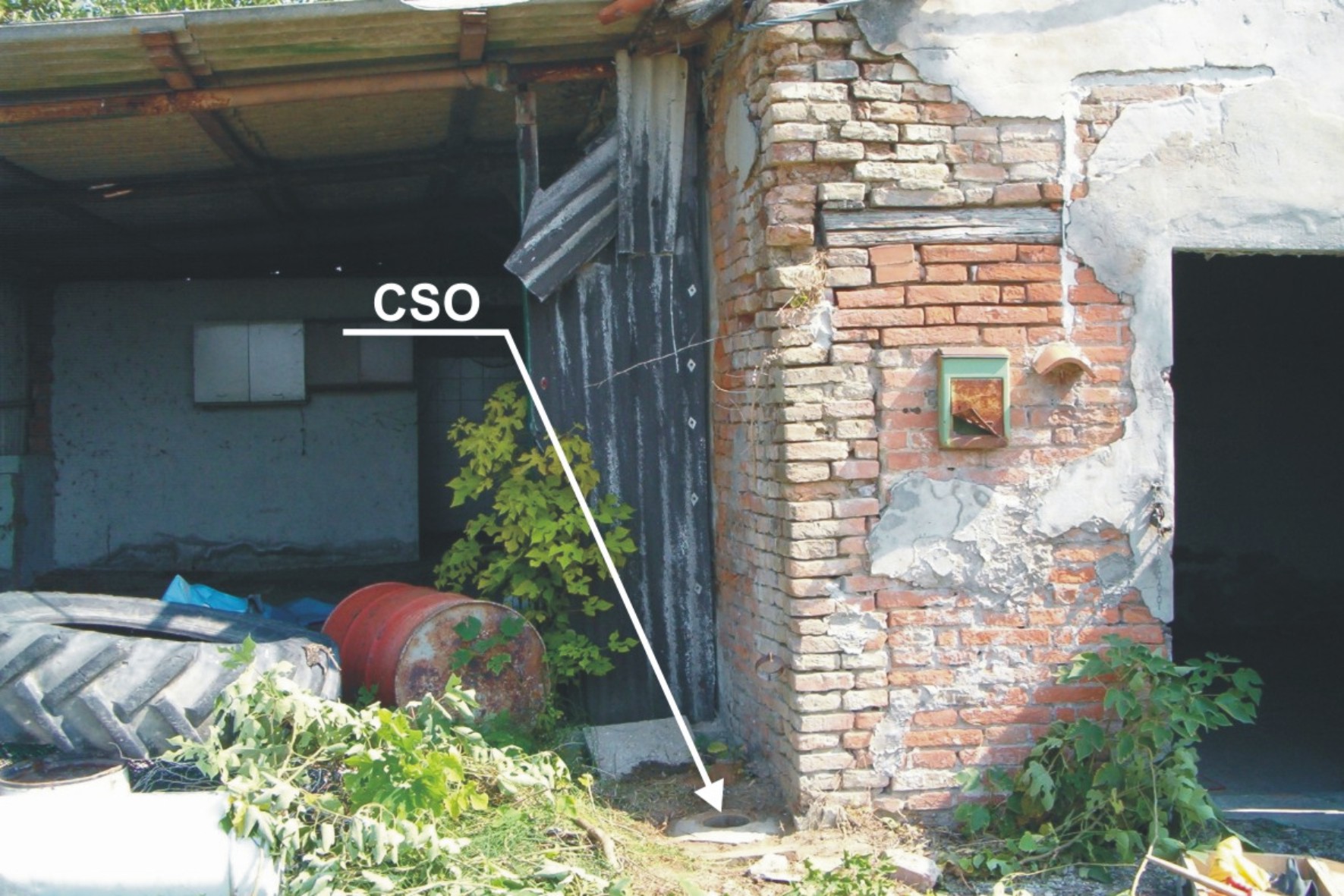 (CSO) - Chiusino in ghisa posto alla base della parete posteriore della casa, tra la tettoia e la casa stessa. Il contrassegno fa parte della Rete Emilia Romagna - Rete Regionale di Controllo della Subsidenza n°060110.