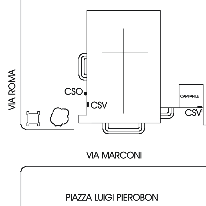 (CSV') - Piastrina antica IGM infissa sulla facciata del campanile, lato via Marconi, a destra della porta in legno.
