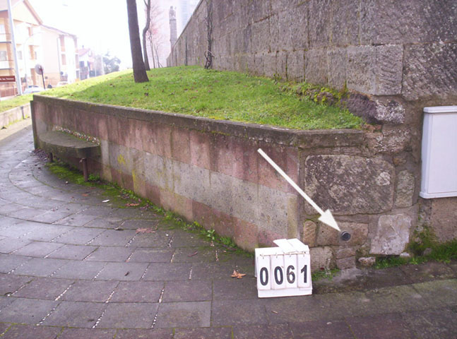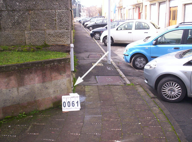 (CSO) - Bullone infisso sull'angolo del muro di sostegno, che delimita gli impianti sportivi, in via F.lli Rosselli difronte al n° civ. 10 e di fianco a una centralina del telefono.