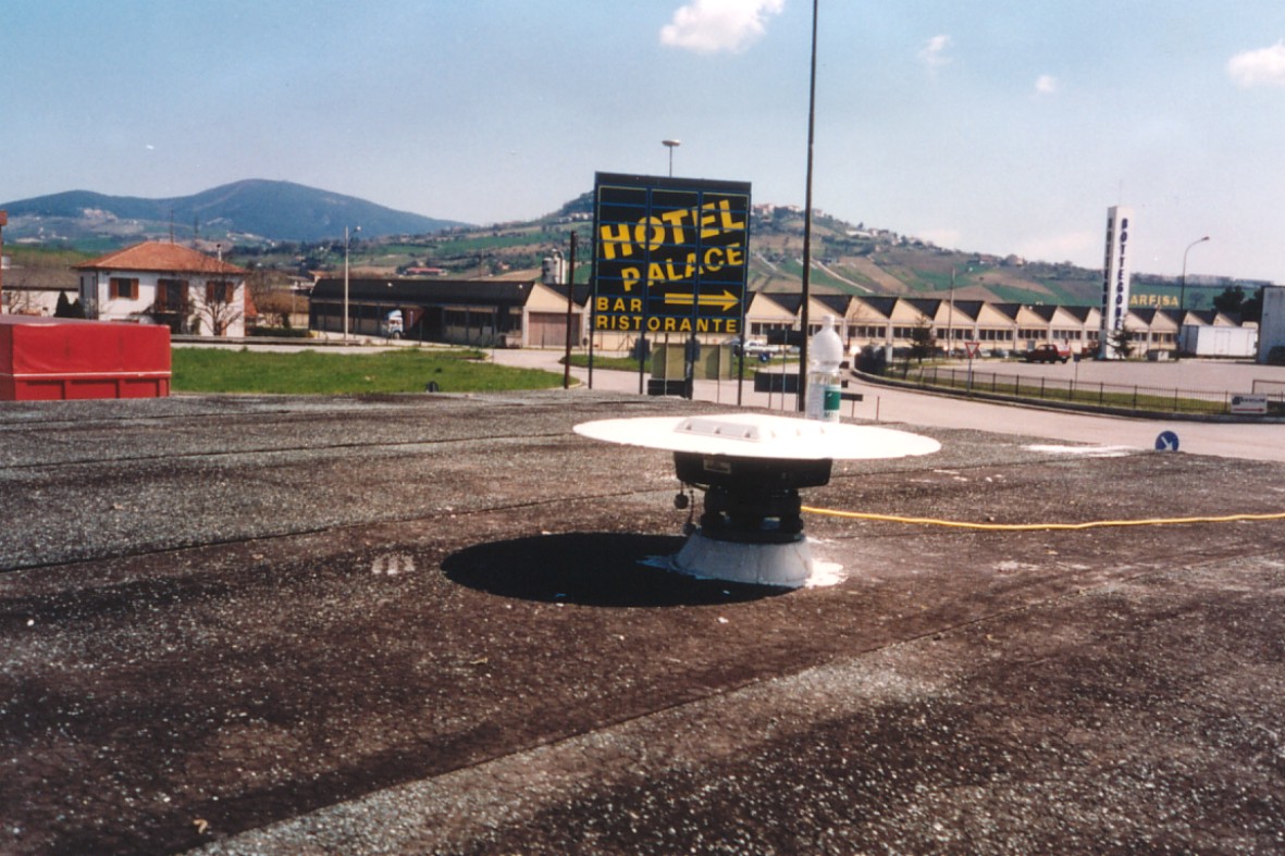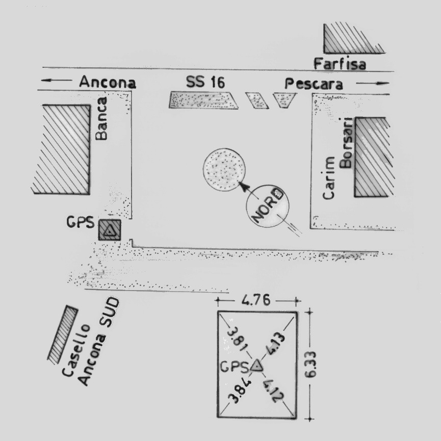 Materializzazione Centrino in acciaio inox del tipo "GPS C" fissato in prossimità del centro geometrico della soletta di copertura della cabina ENEL.