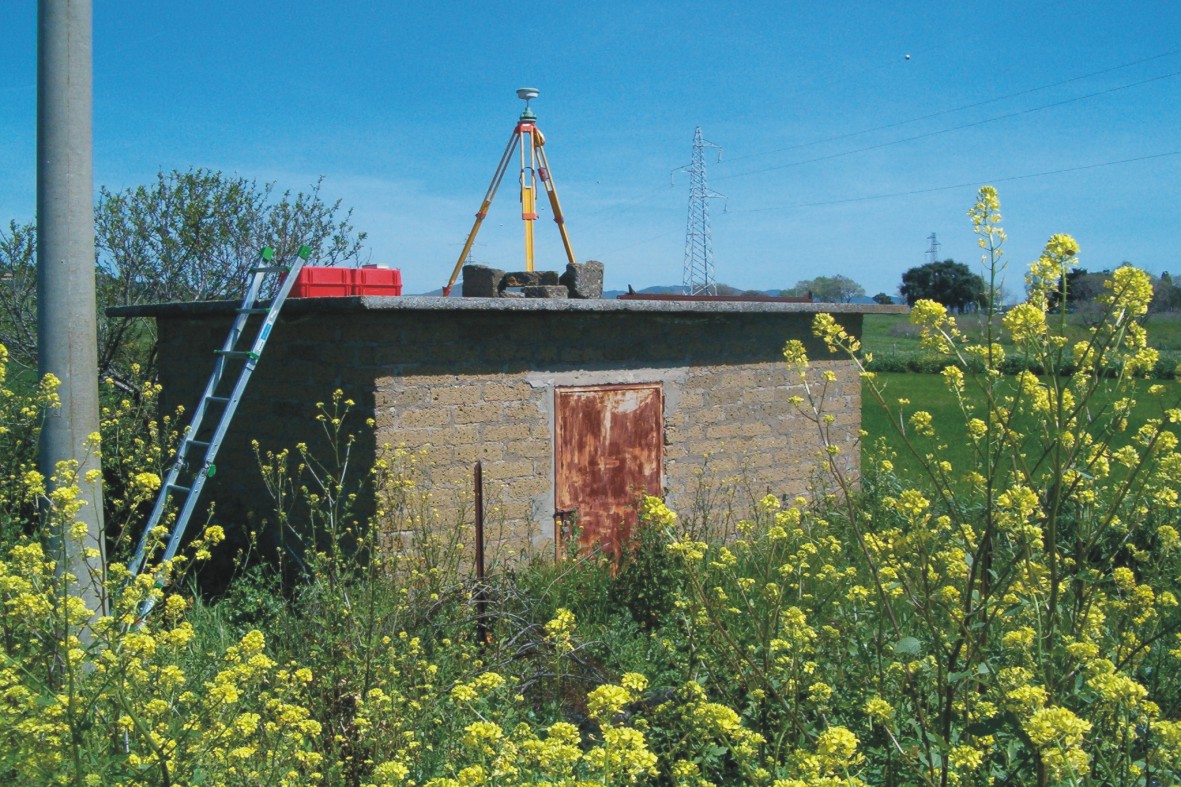 Materializzazione Centrino di tipo "GPS C" fissato alla sommità della soletta di copertura del casotto del pozzo idrico sito in località "Chiarone" e coincidente con l'asse geometrico dello stesso.