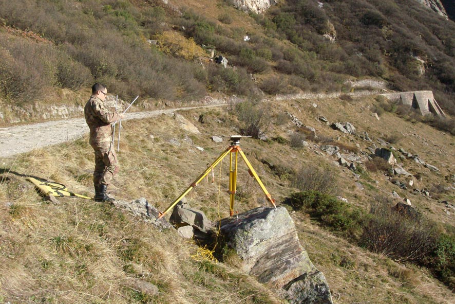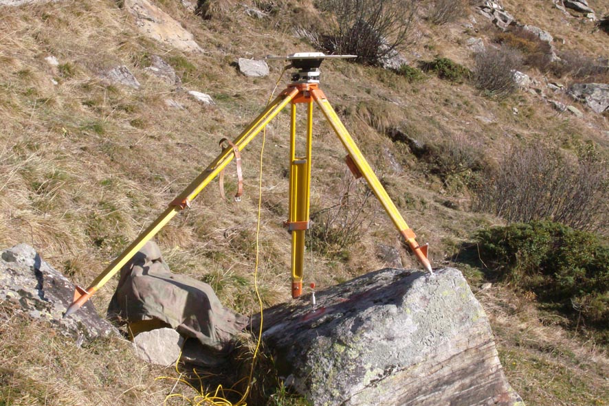 Materializzazione Centrino universale IGM infisso su di uno spuntone roccioso posto a valle della stradina che conduce al Passo San Giacomo a circa metà del tratto di strada compreso tra il IV° e V° tornante.