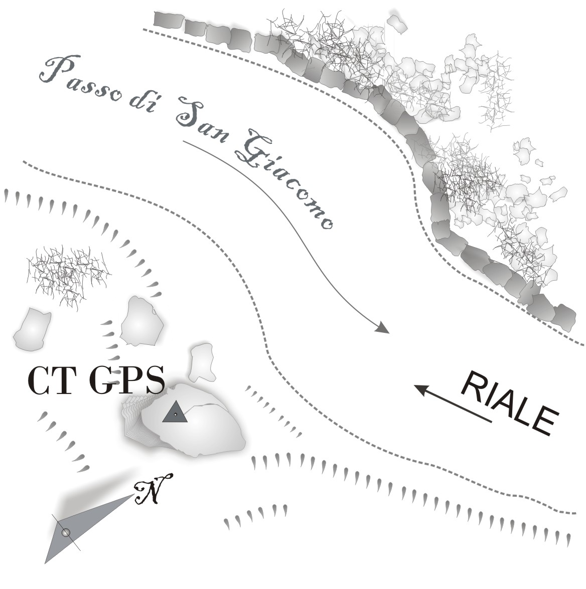 Accesso Dalla frazione di Riale percorrere la strada sterrata che conduce a Passo San Giacomo dopo aver superato il IV° tronante di circa 50 m. a valle della strada si trova un blocco roccioso.