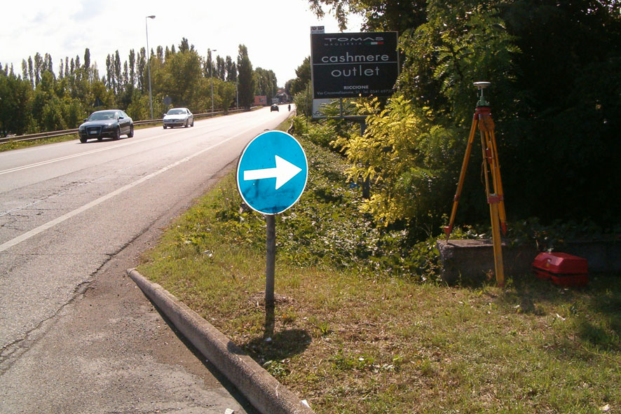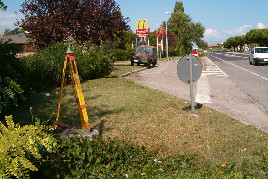 Materializzazione Centrino metallico con la scritta "AZIMUT VTP8" infisso sulla testa del muretto in cemento armato delimitante la zona a parcheggio del ristorante Mc Donalds, posto lungo la S.S. 16.