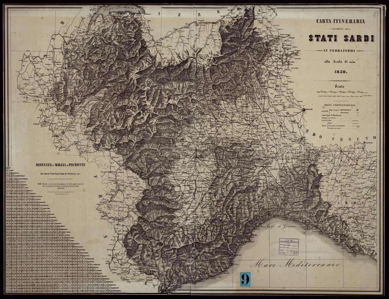 Litografia in foglio unico, stampato in nero con orografia a tratteggio, abitati distinti in base alla loro importanza amministrativa; strade classificate in reali, provinciali e carreggiabili e mulattiere. A sinistra elenco di distanze, calcolate in miglia di Piemonte, fra le citt capo-luoghi di provincia.