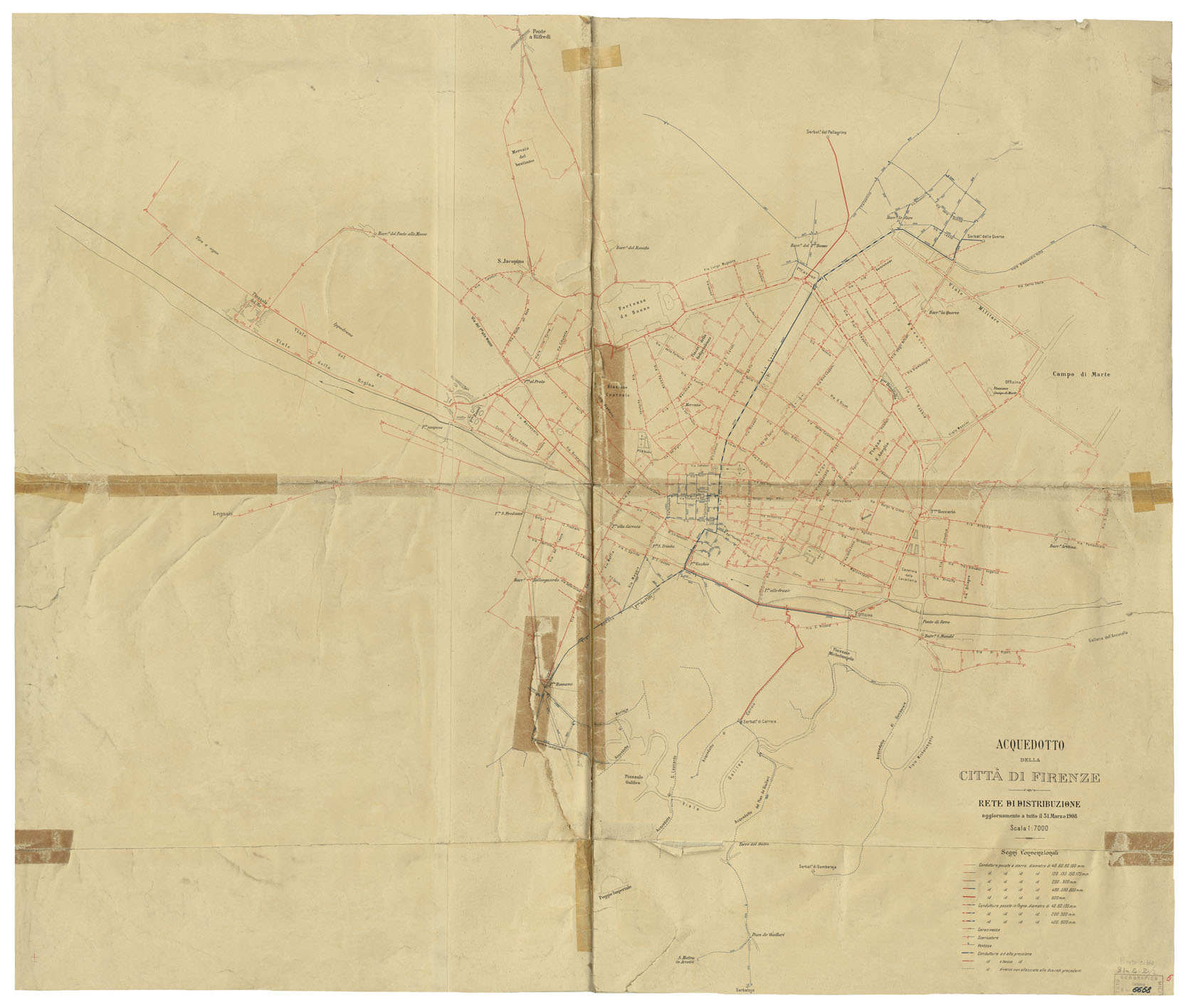 (N:36050) ACQUEDOTTO DELLA CITTA' DI FIRENZE - RETE DI DISTRIBUZIONE AGGIORNAMENTO A TUTTO IL 31 MARZO 1908 (B0021295) Carte e stampe antiche: riproduzione digitale a 150 DPI