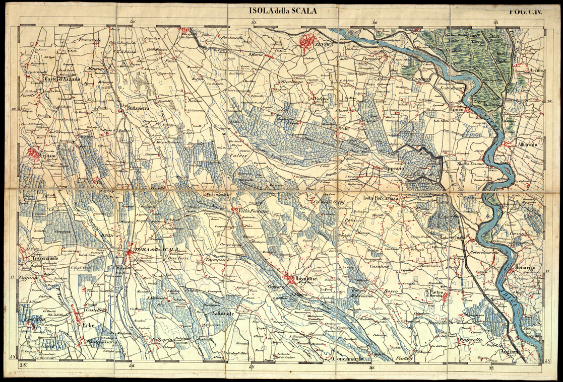 (N:3468) CARTA DELLA PARTE CENTRALE DELL'ALTA ITALIA AUTOGRAFATA NELL'UFFICIO TOPOGRAFICO DEL CORPO REALE DELLO STATO MAGGIORE - Foglio C IV ISOLA DELLA SCALA (B0003355) Carte e stampe antiche: riproduzione digitale a 300 DPI