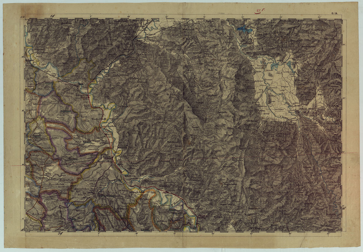 Dodici fogli estendentisi da Radicofani (nord) a Terracina (sud) e dal Lago di Fucino (est) al Monte Argentario (ovest). Riproduzione autografica con colori a mano per le circoscrizioni. Uno dei fogli contiene un prospetto di quote altimetriche di vari punti trigonometrici nel Granducato di Toscana.