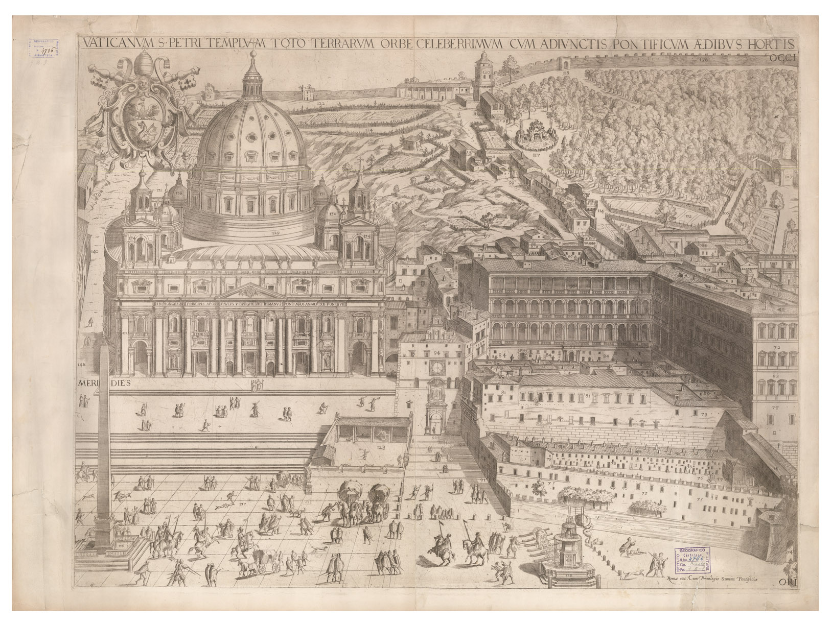Cum adiunctis pontificum aedibus hortisq accurate delineatum ea omnia paulus v. pont max multis partibus amplificavit ornavitoque. E' la grande veduta Maggi-Mascardi del 1615, del Tempio e del Palazzo Vaticano, riprodotta dai rami originali a cura della Biblioteca Vaticana ("Le Piante maggiori di Roma dei secoli XVI e XVII riprodotte in fototipia a cura della Biblioteca Vaticana". Appendice N 1) in due grandi fogli di m. 0,91x0,69. La riproduzione accompagnata da un testo illustrativo a cura di Francesco Ehrle S. I. in cui vengono date notizie su gli autori della veduta, la data, la stamperia e vi esaminato il contenuto di essa; vi sono inoltre riportate le leggende e l'elenco dei nomi.