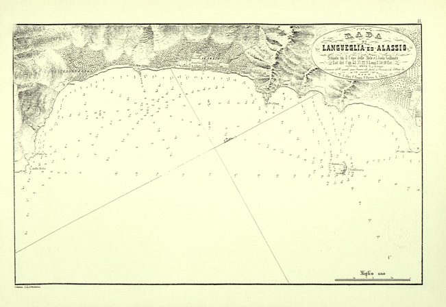 Rada di Langueglia ed Alassio situata tra il Capo delle Mele e l'Isola Gallinara Lat. del Cap. 4357'22" N. Long. 530'10" Est.
