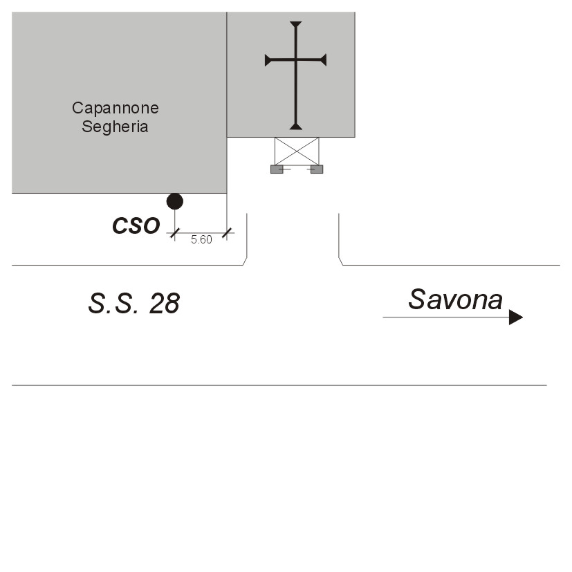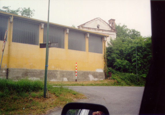 (CSO) Bullone di ghisa cementato alla base di un capannone adiacente la chiesa della Madonna di Guarene a m 6.60 dallo spigolo destro