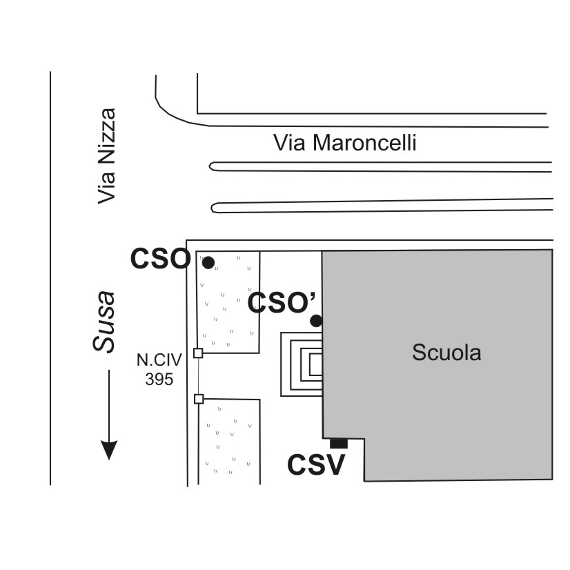 (CSO') Bullone infisso sulla facciata della Scuola, lato sinistro della porta d'ingresso, in corrispondenza del gradino più basso a 20 cm circa da terra.