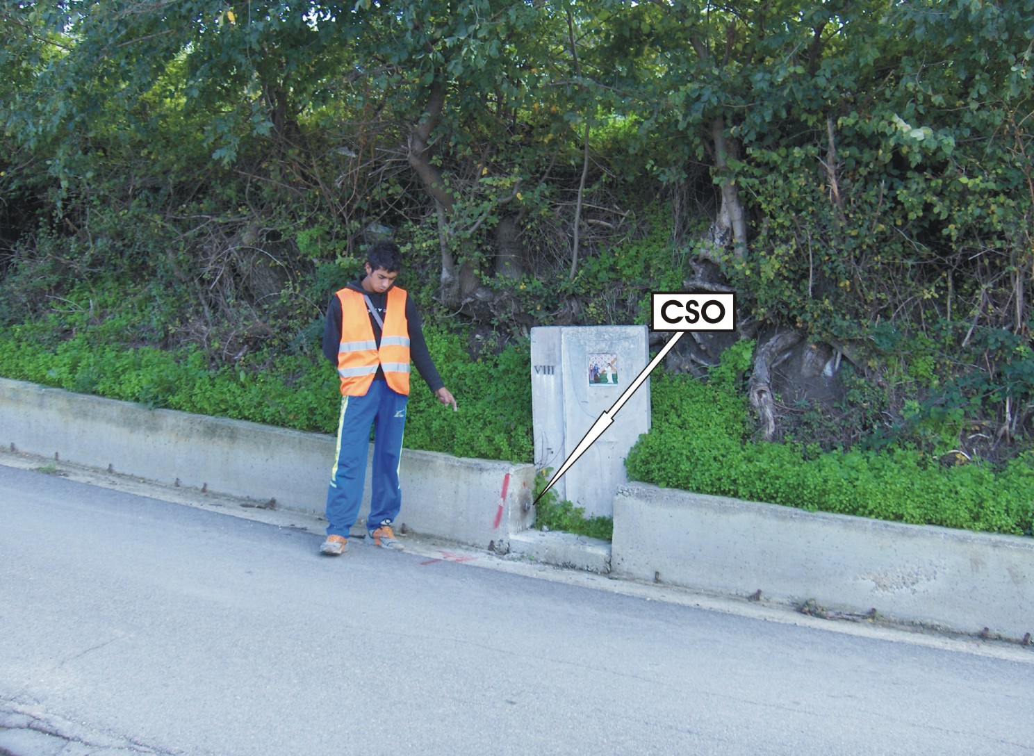 (CSO) - Bullone infisso nella testa del cordolo in calcestruzzo a destra della S.P.35 al km 2,050, lato monte, in corrispondenza dell'apertura per la stazione n° VIII della Via Crucis.