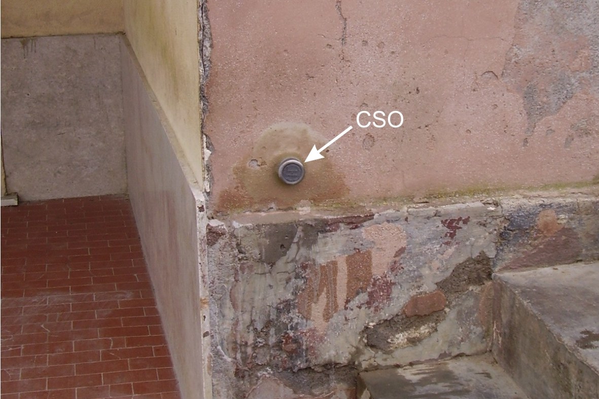 (CSO) - Bullone infisso sulla parete del manufatto, lato strada, in corrispondenza del primo gradino di accesso al magazzino di ferramenta.