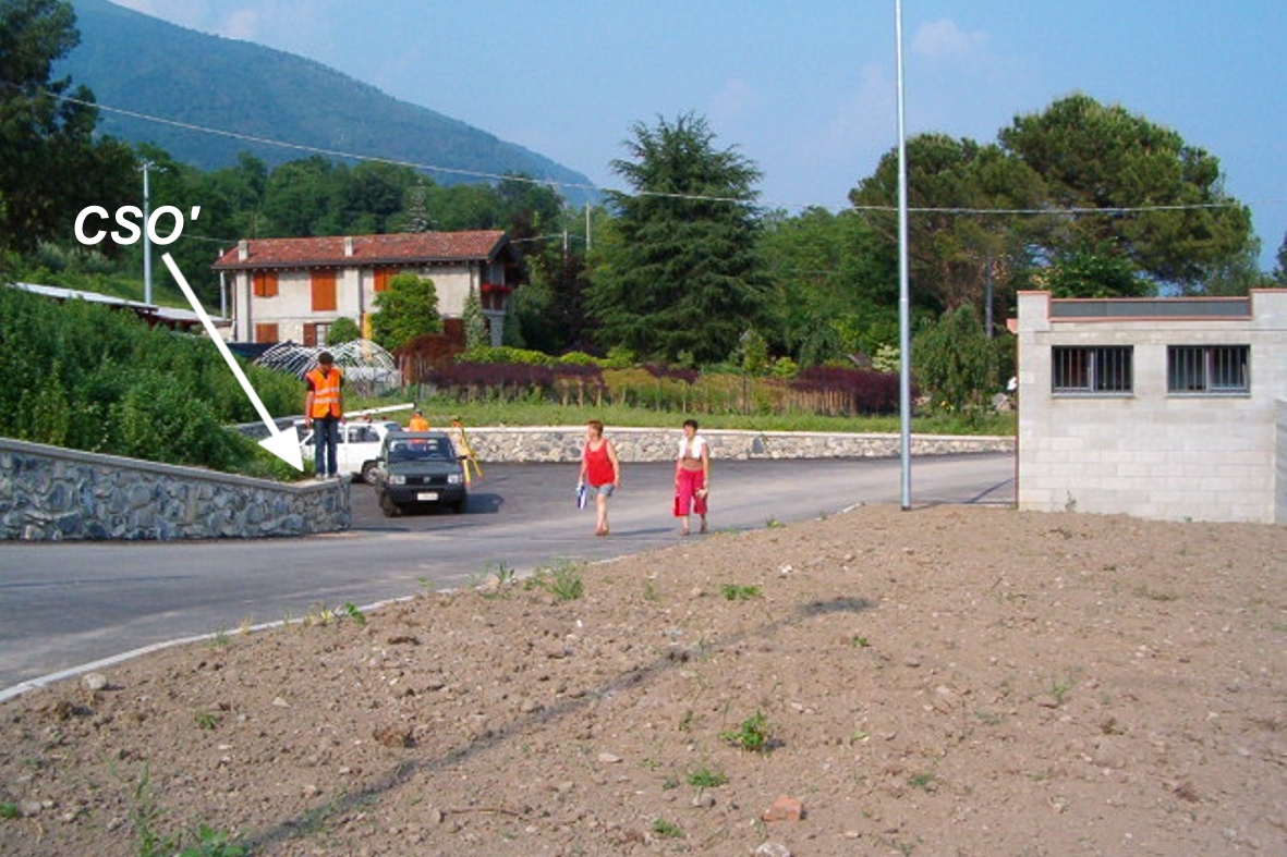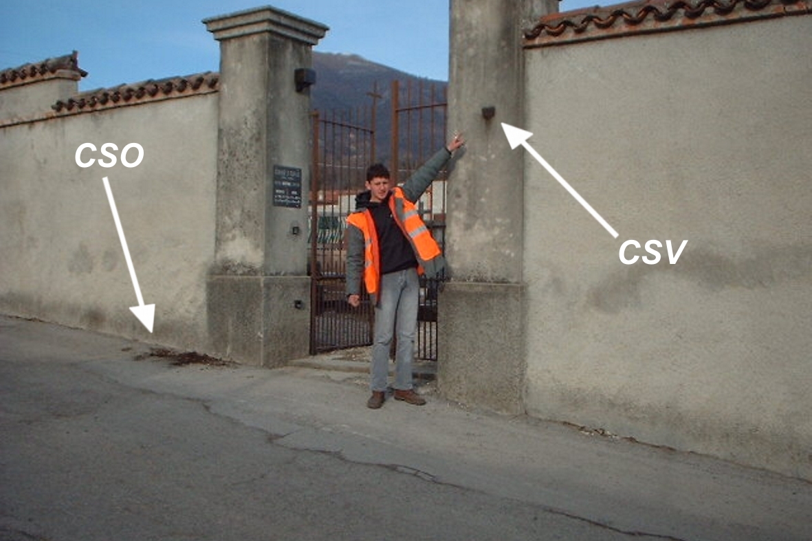 (CSO') - Centrino universale infisso sulla sommità di un muro di contenimento del parcheggio posteriore del cimitero in prossimità della curva che il muro forma prima dell'accesso al suddetto parcheggio, non appena la sommità diventa orizzontale (idoneo GPS).
