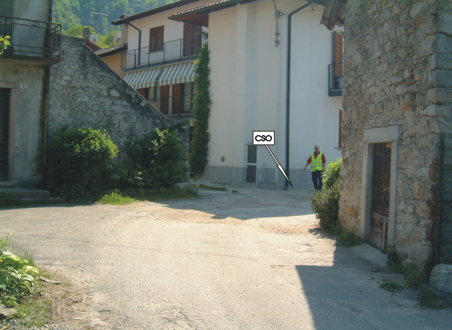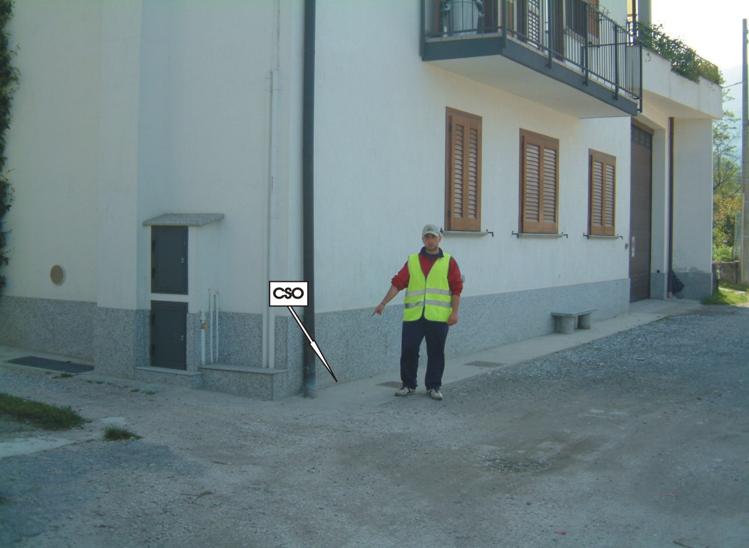 (CSO) - Centrino universale infisso sul marciapiede in cemento, lato strada, e alla base della facciata presso lo spigolo sinistro della casa.