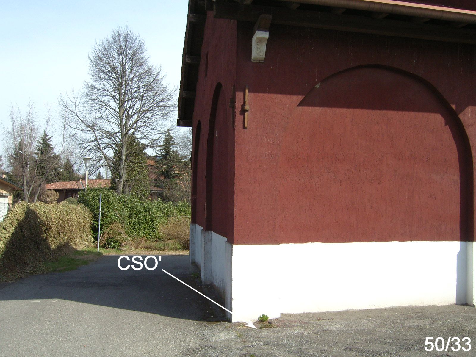 (CSO') - Pozzetto rialzato con tubo in PVC e coperchio in ghisa, alla base del pilastro del loggiato chiuso, prospiciente la strada, presso lo spigolo sinistro.