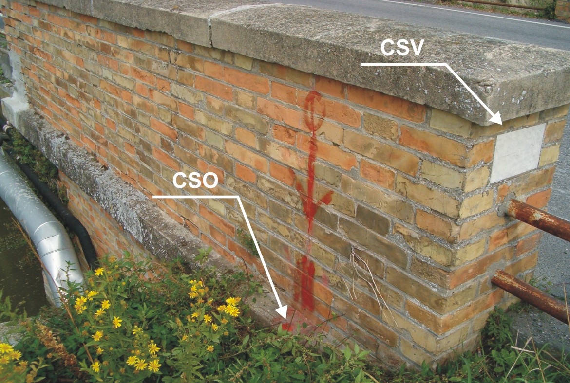 (CSV) - Targa con linea incisa (1949) di altro Ente infissa sul parapetto in corrispondenza del CSO ma nella facciata interna alla strada .