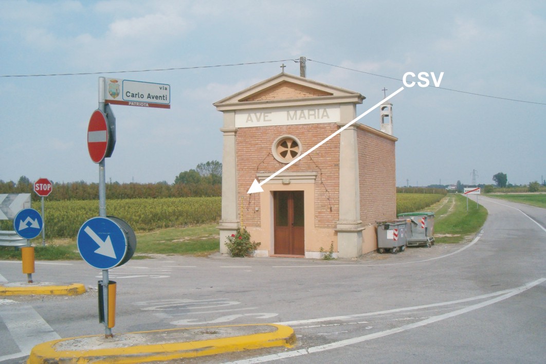 (CSV) - Piastrina zincata del Catasto infissa sulla facciata della cappelletta posta all'incrocio fra via Carlo Aventi e la S.S. 495, a sinistra della porta d'accesso.