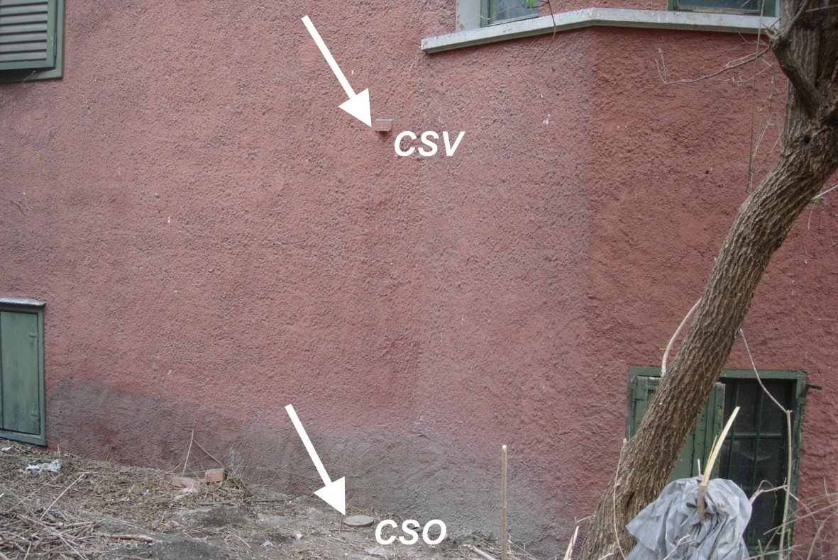 (CSO) - Pozzetto rialzato con tubo in pvc e protetto con coperchio in ghisa, posto alla base della facciata , in prossimità dell'angolo formato dal corpo avanzato.