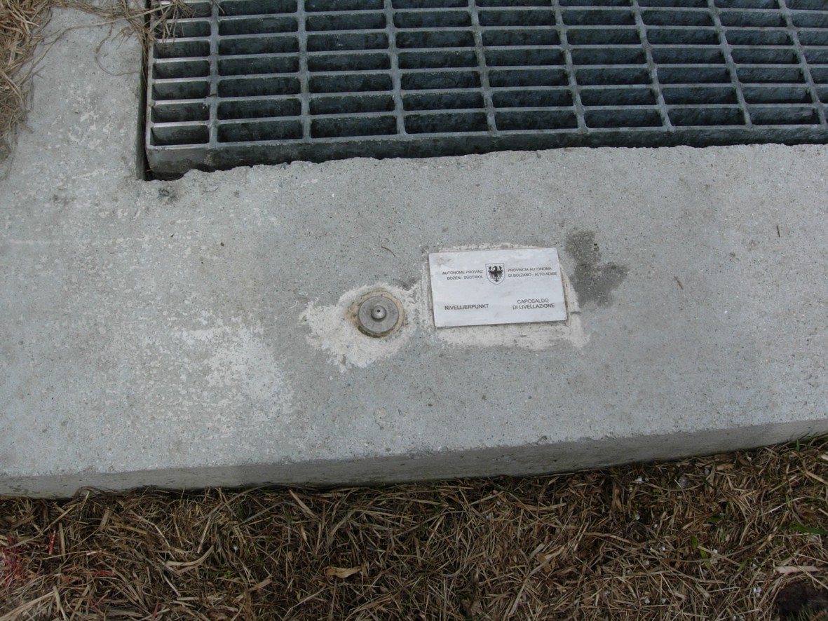 (CSO') - Bulloncino da livellazione della BBT, numero BT 15800, posizionato nelle fondamenta di un pozzo recintato.
