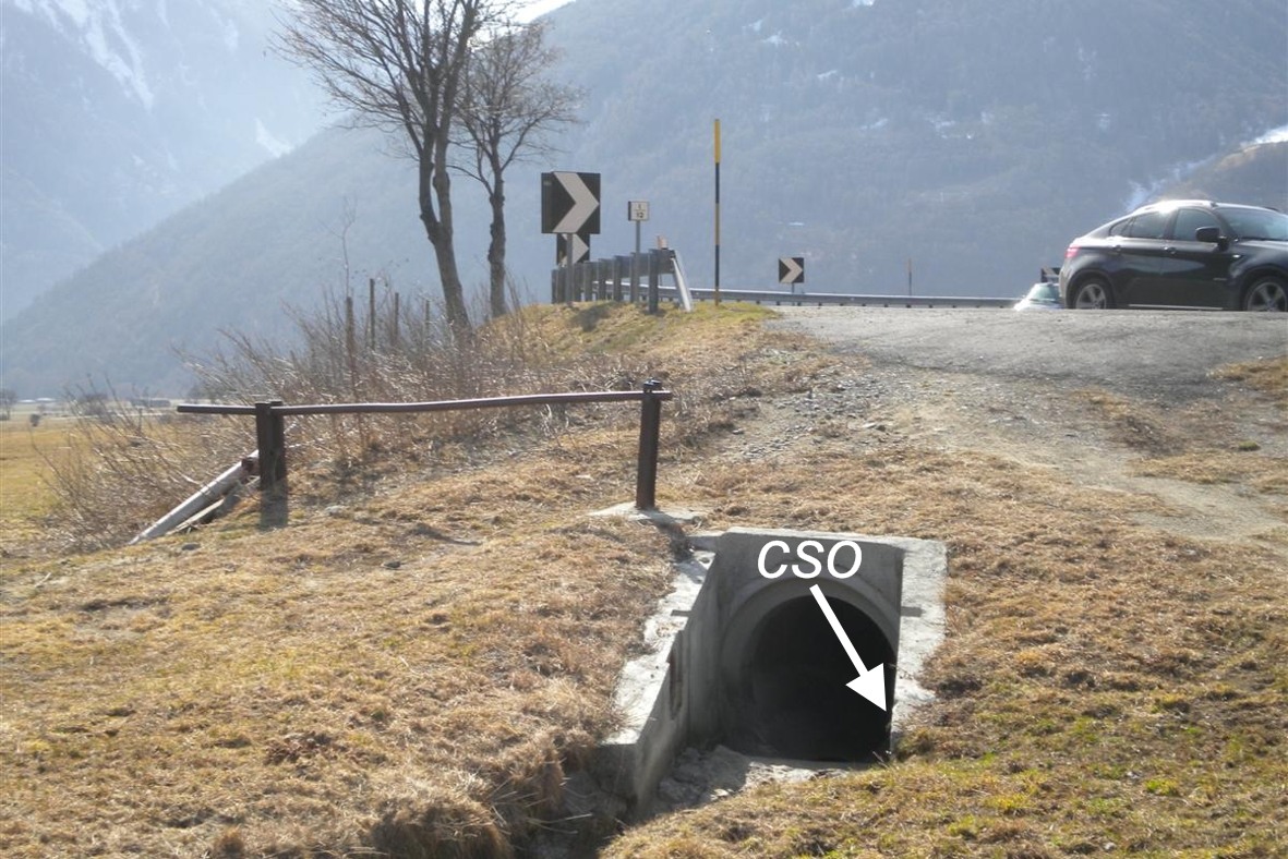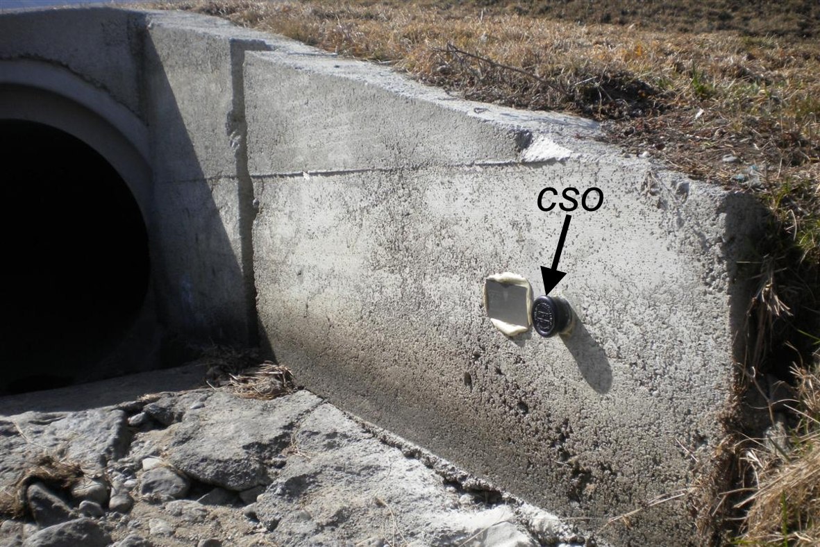 (CSO) - Bullone infisso nel muro in cemento armato dell'entrata del tombino, in riva destra, a monte della strada.