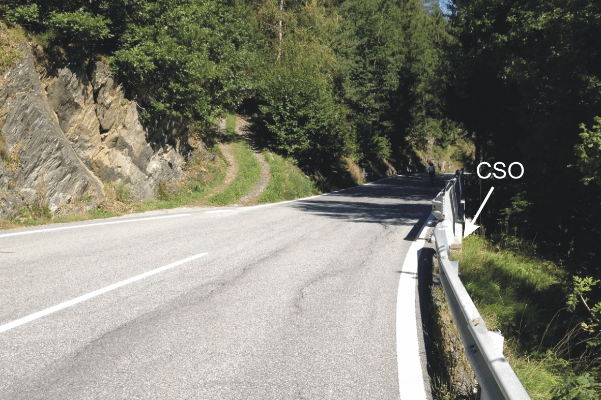 (CSO) - Bullone infisso all'inizio del cordolo in cemento armato di ancoraggio del guard-rail, posto di fronte all'imbocco di una strada di campagna.