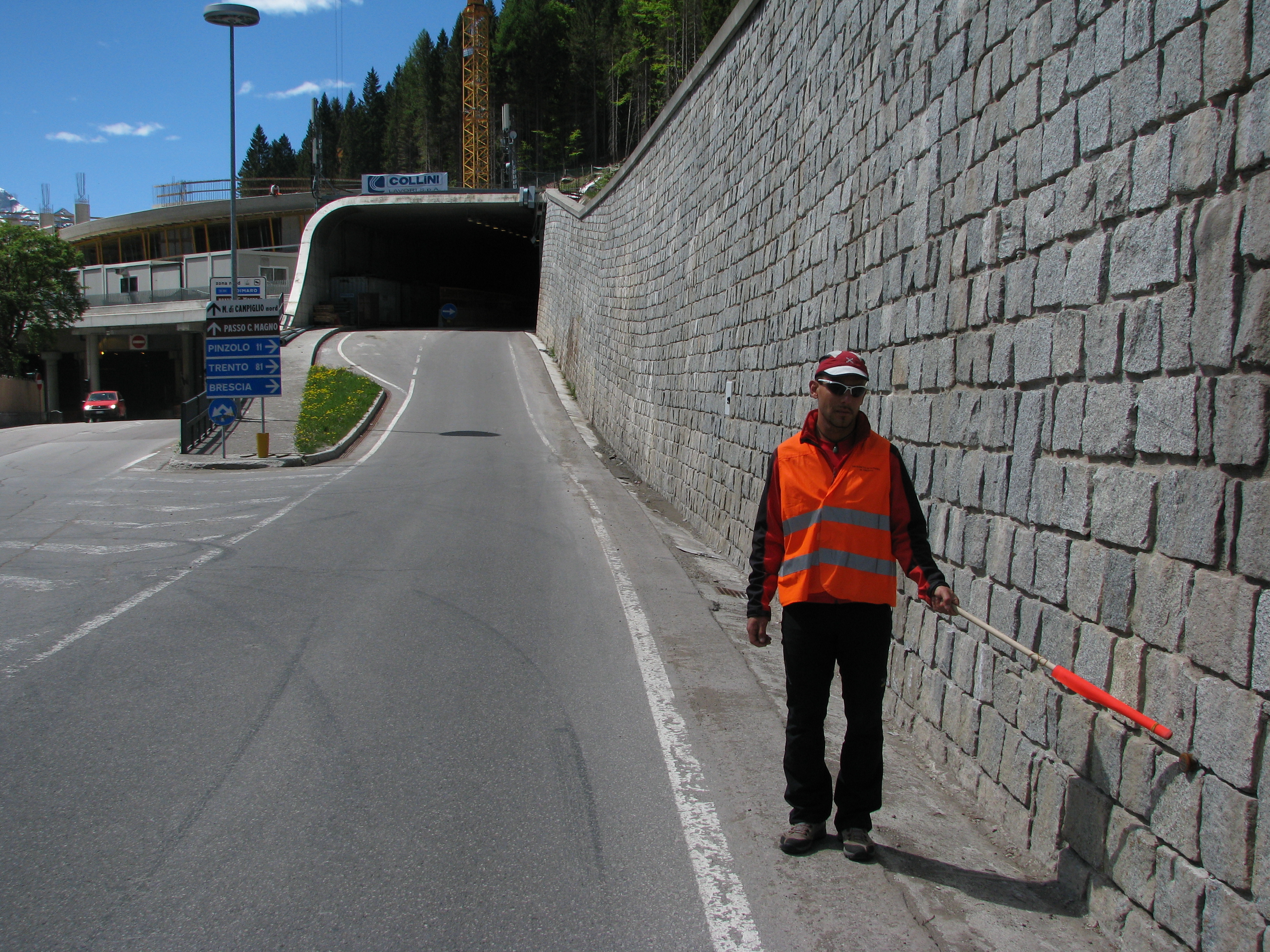 (CSO) - Bullone infisso nel muro a retta di monte rivestito in pietra della strada appena usciti dalla galleria che immette nel centro abitato di Madonna di Campiglio.