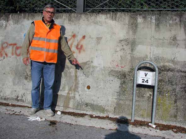 (CSO) - Bullone infisso su un muro in cemento delimitante l'ingresso ad una stradina laterale a fianco del chilometro 24,500.