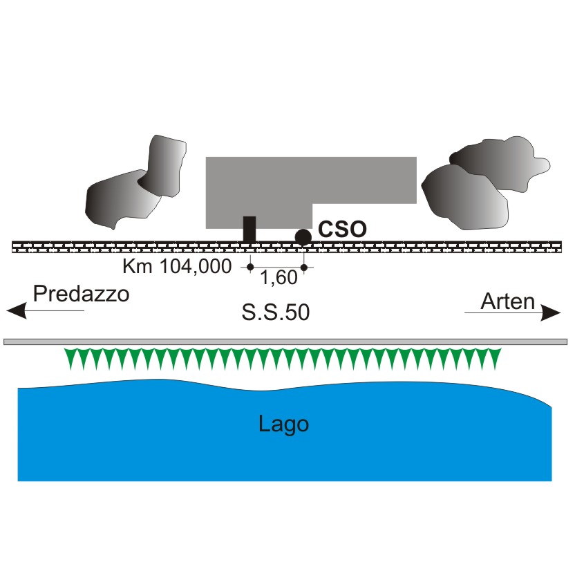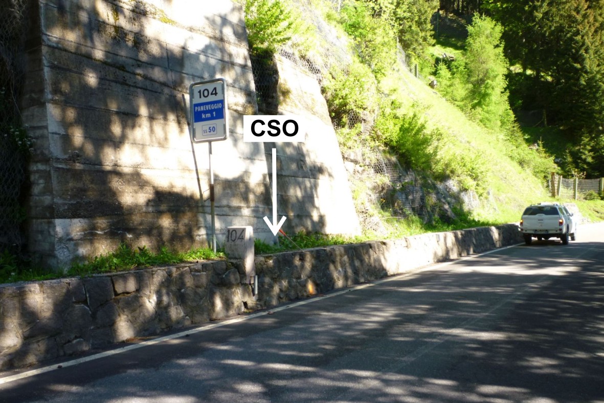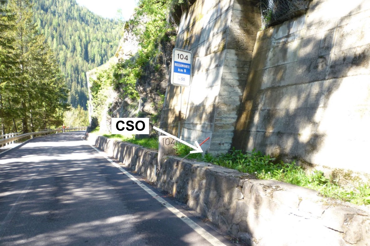 (CSO) - Bullone infisso nel contrafforte in cemento armato a monte ubicato a circa 1,60 della pietra chilometrica sulla sinistra.