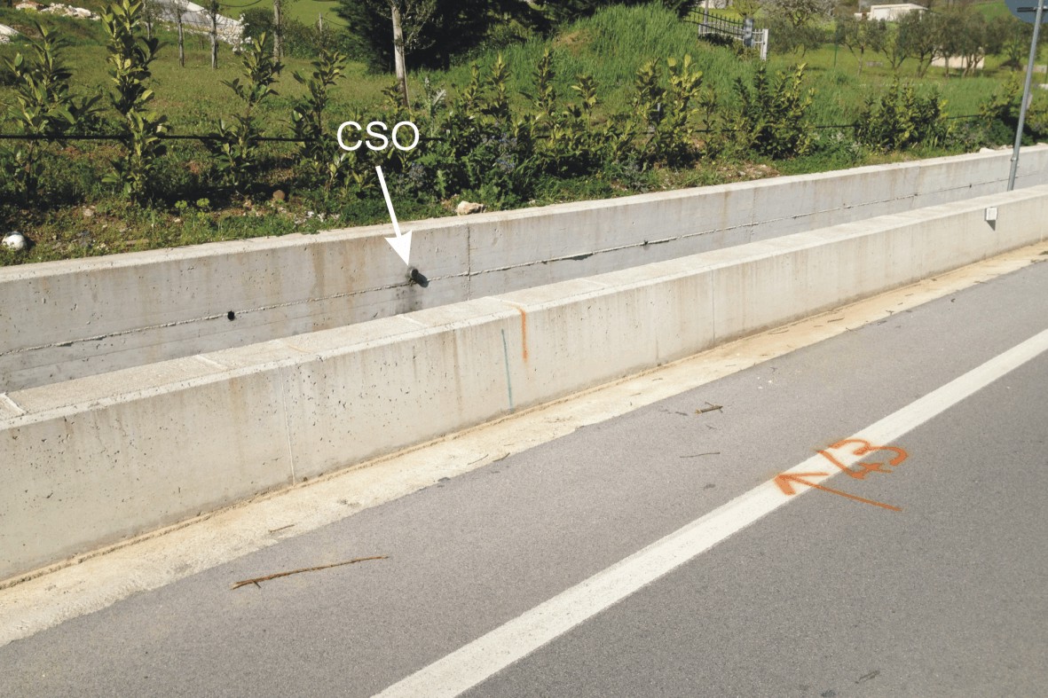 (CSO) - Bullone infisso sul prospetto lato strada di una canaletta in calcestruzzo di scolo delle acque
