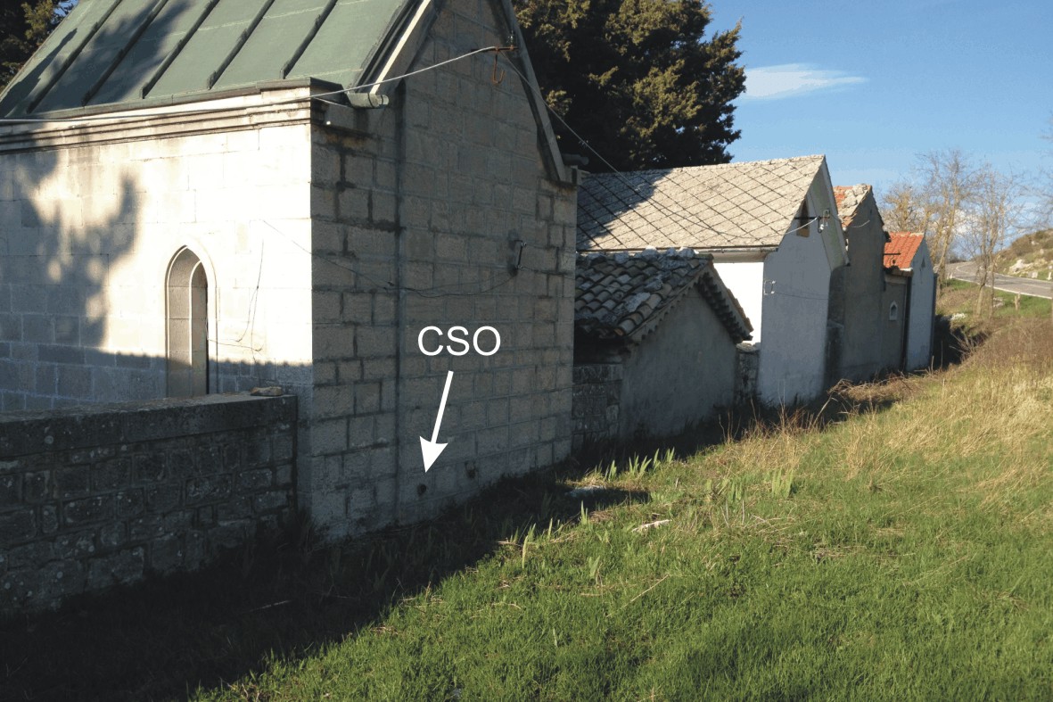 (CSO) - Bullone infisso nel muro lato strada dell'edicola funeraria centrale