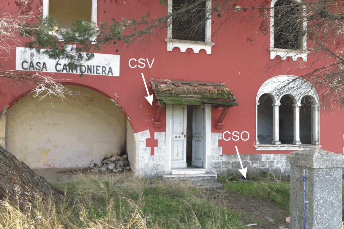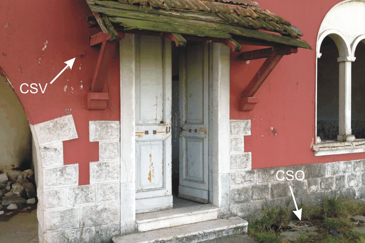 (CSO) - Chiusini in ghisa posto alla base della facciata tra la porta d'ingresso e la finestra di destra