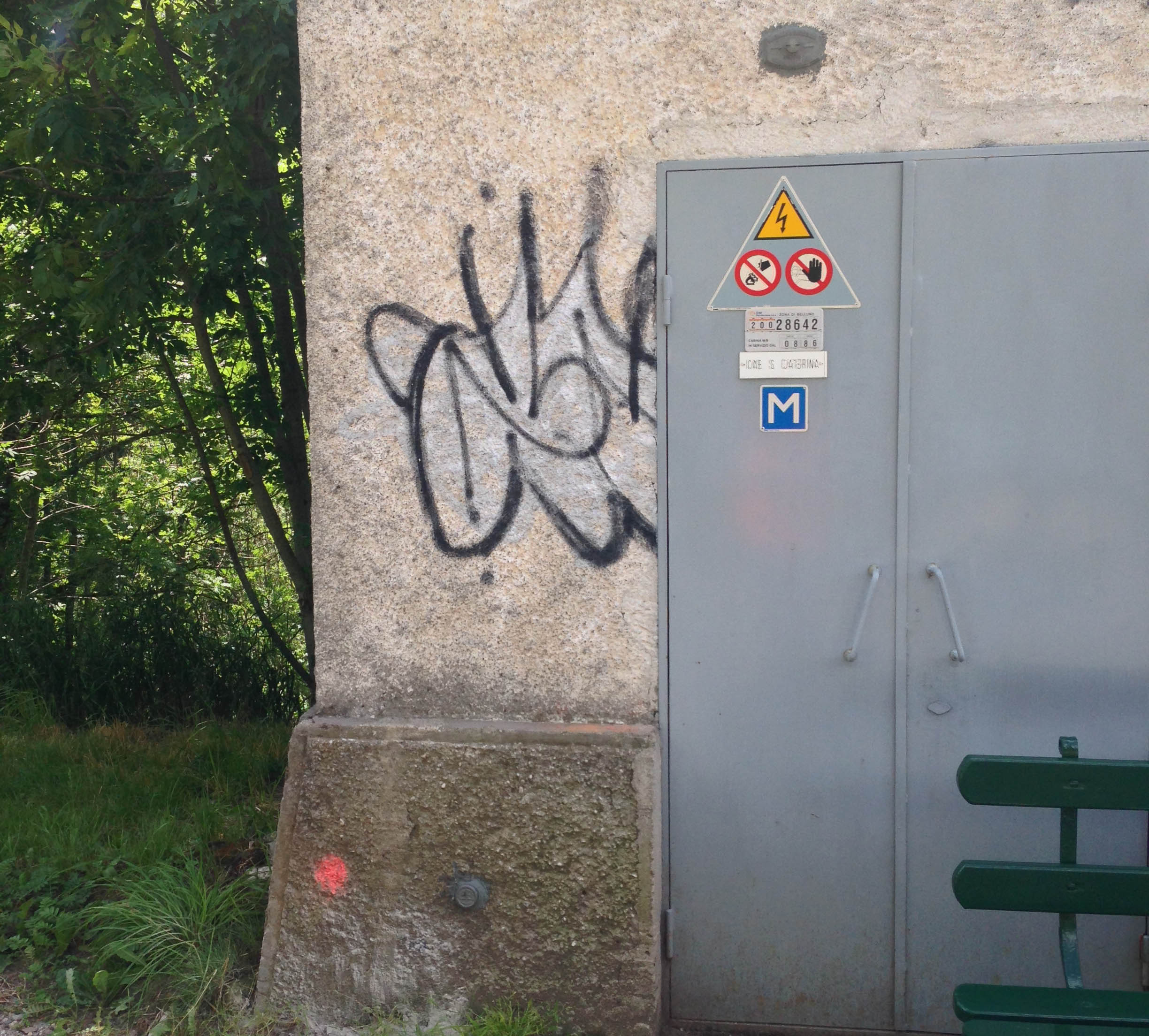 (CSO) - Bullone infisso sulla facciata della cabina elettrica, in prossimità dello spigolo sinistro.