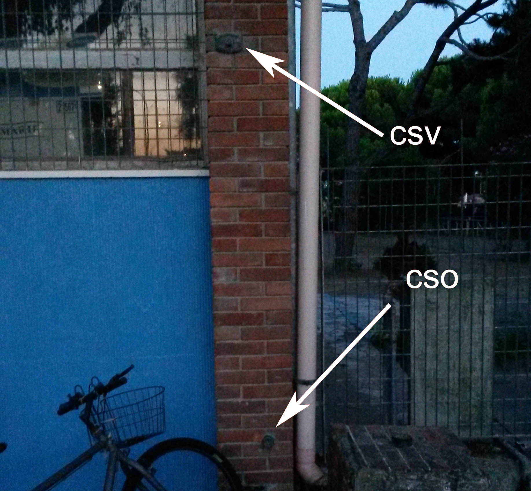 (CSO') - Centrino anonimo infisso sulla sommità del cordolo di recinzione, a 1,5 m dallo spigolo destro dell'edificio.