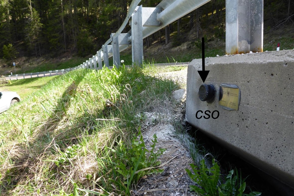 (CSO) - Bullone infisso nel cordolo in cemento armato del guard rail posto a valle e a sinistra in direzione Belluno.
