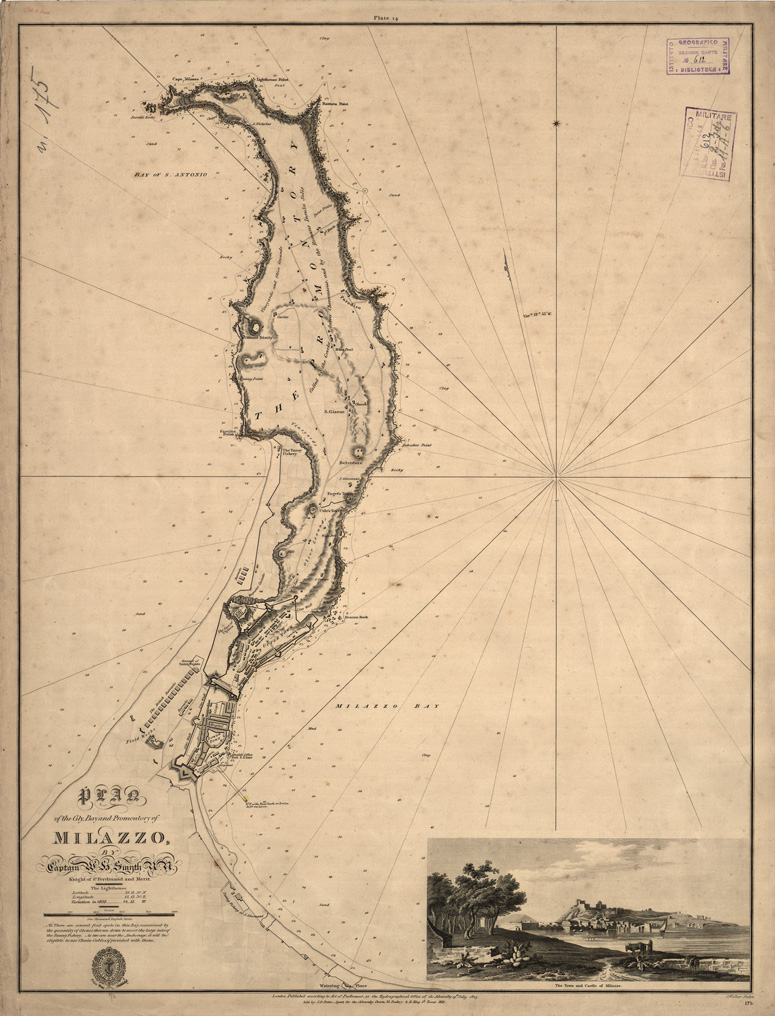 Rappresentazione orografica a tratteggio. In basso a destra presente la veduta della citt e castello di Milazzo. J. Walker sculpt. Ammiragliato Britannico, Londra.