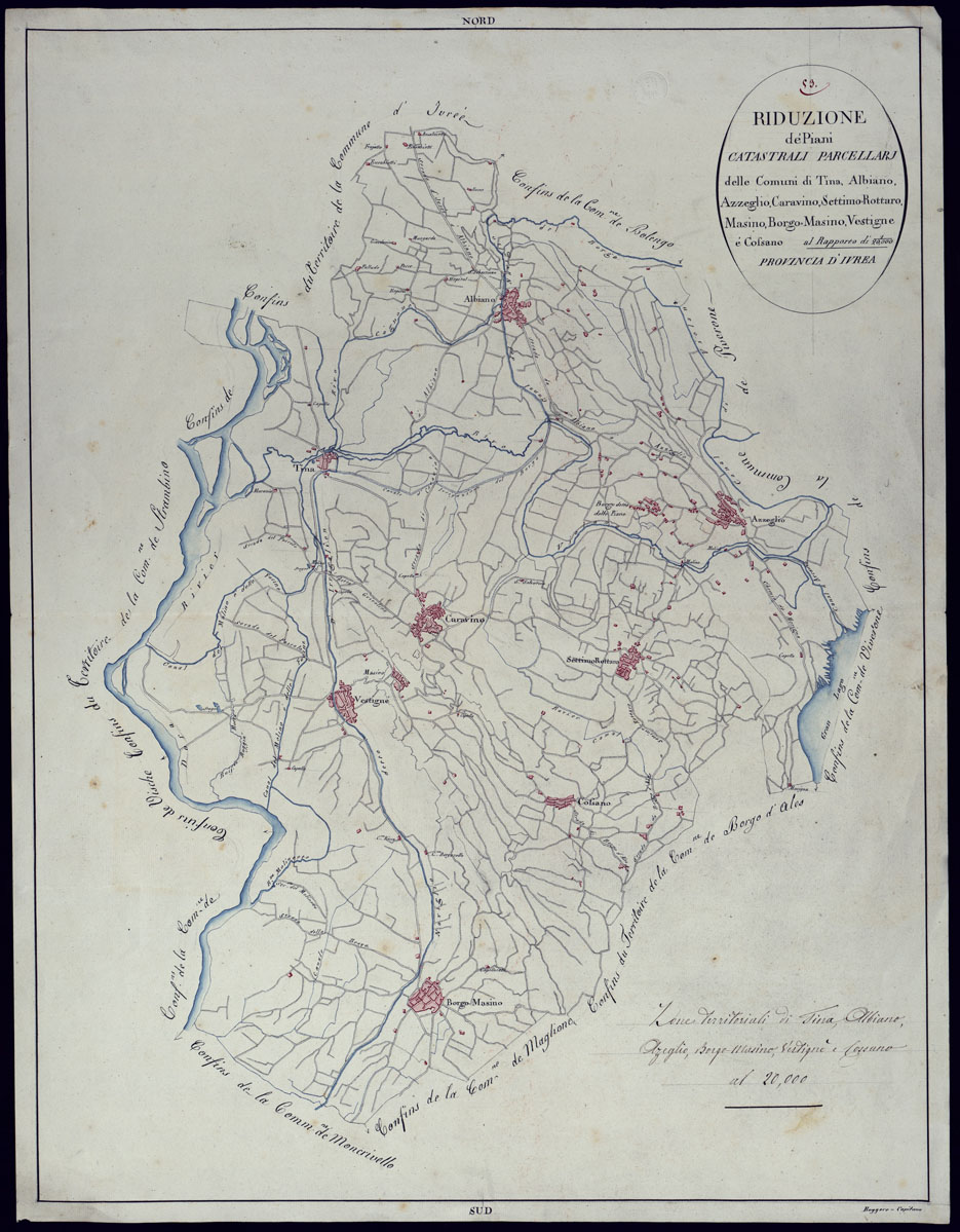 (N:13007) TERRITORIO COMPRESO TRA RACCONIGI, MORETTA, SAVIGLIANO, ALESSANDRIA ED IVREA - RIDUZIONE DEI PIANI CATASTALI PARCELLARI DEI COMUNI DI TINA, ALBANO, AZZEGLIO, CARAVINO, SETTIMO-ROTTARO, MASINO, BORGO-MASINO, VESTIGNE E COSSANO - PROVINCIA D'IVREA. (CA001912) Carte e stampe antiche: riproduzione digitale a 150 DPI