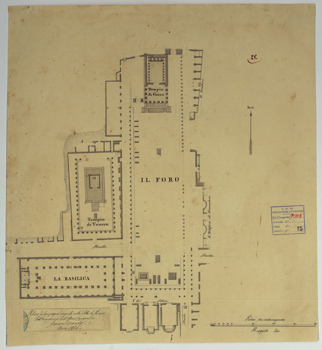 Docum. 63. Trentatr minute a scale varie e di dimensioni diverse, dei rilievi eseguiti dal 1826 al 1840 dall'Ing. Marchesi parte dei quali servirono per la costruzione della "Pianta degli scavi di Pompei" (Docum. 61 - n. di categorico 9016).