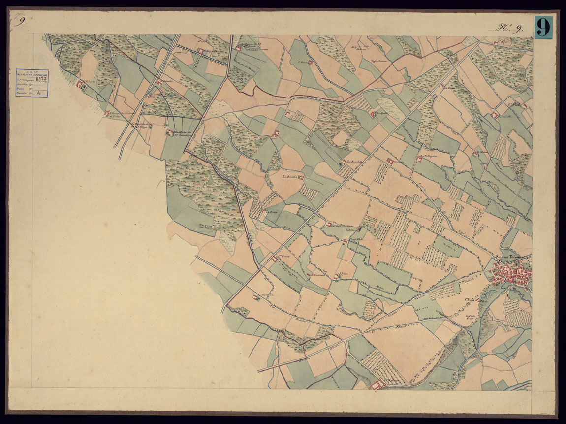 Copia in bello della carta di cui al documento n. 8, accuratamente disegnata ed acquerellata, e suddivisa in 37 fogli pi un quadro d'unione. Da note apposte in margine ad alcuni fogli si deduce che il disegno fu fatto negli anni 1821-22 dai Signori Basso, Bergalli, Brambilla Vittorio, Brignone, Burrio, Conti, Cossato, Gianotti, Rinaudo, Roggero e Valsecchi.